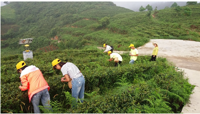 同时在受到当地茶企业管理人员的邀请下调研队亲自体验了茶叶从采摘到茶成品制作的全部过程。之后根据当地主要以发展茶叶为主,调研队队员走到田间地里结合自己的专业知识,采集了茶园主要的病虫害标本通过鉴定和咨询对当地的病虫害有了一定的了解,制定了一些简单的防治方案并给当地的农民讲解了有关的方法,除了病虫害标本的采集调研队还对茶园的土质进行了样品采集,用于后期的检测与分析争取达到对当地茶产业全方位的了解。