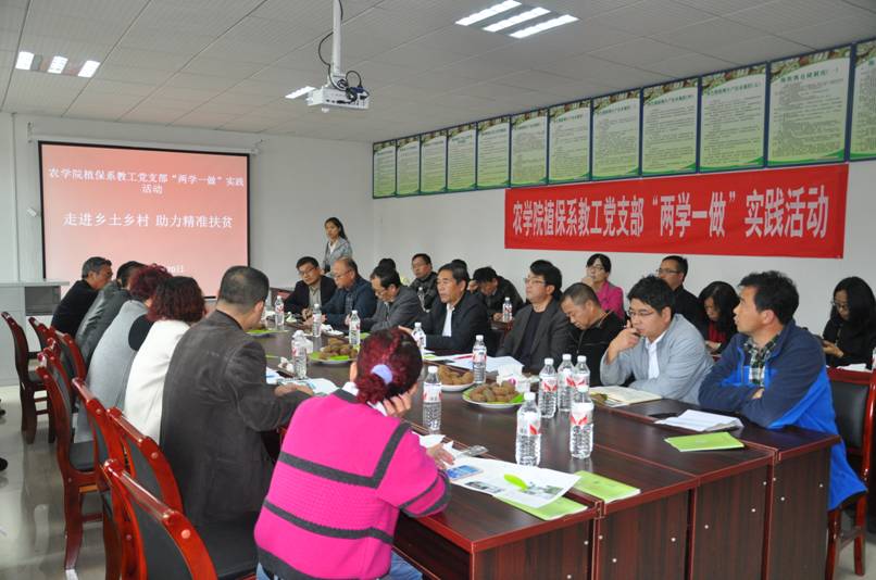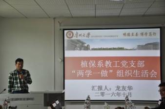 在随后进行的党组织生活会上,植保系教工党支部书记龙友华同志介绍了植保学科科研团队从2004年至今,在社会服务,助力精准扶贫方面开展工作的情况、取得的成绩。与会党员纷纷结合实际,就在“两学一做”学习教育中,怎样更好的发挥学科优势,助力地方精准扶贫,做了交流发言。