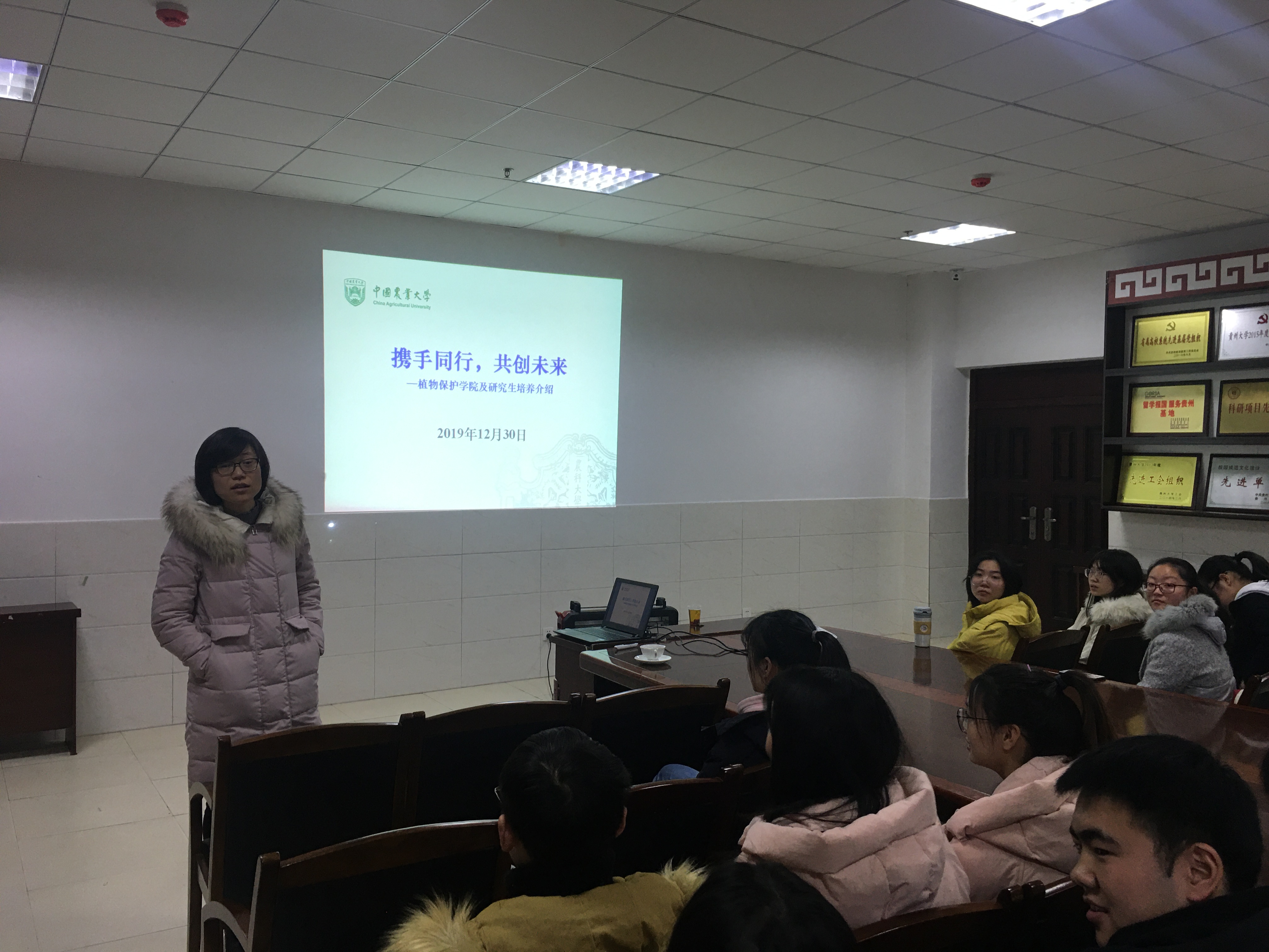 刘姝言副书记讲座的题目是:携手同行,共创未来。刘姝言副书记首先对中国农业大学的历史及该校植物保护学院的基本情况进行了简单的介绍;接着她针对当下学生思想上出现的迷茫与困惑,用自己的一些亲生经历和所见所闻帮同学们解疑答惑,她提到,一个人的自信并非是说出来的,而是踏踏实实“做”出来,从身边的小事一点一滴开始积累起来。而这些小事便是“读万卷书,行万里路”。“读万卷书”,读的不仅仅是自己本专业的书,也可以读专业书籍以外各式各样的书,以扩展丰富自己各方面的知识,并且不要为了读书而读书,读书要有与自己相链接的地方,让书中的知识融入自己的生活,通过不同的书看到不同人的思想,从而产生自己的想法,让自己做到“像人一样思考,像机器一样执行”。“行万里路”,一是多出去走走,感受不同地方的历史人文气息;二是多参加活动,锻炼自己各方面都能力;三是多与人交流,学会交流、懂得交流会让自己少走许多弯路。她为同学们提供了一些知名专家和教授,激励同学们努力学习、奋勇向前。最后,刘姝言副书记给同学们提出了三点建议:一是明确你的职业和学业规划;二是珍视你所拥有的成长平台;三是投入你所热爱的研究工作。