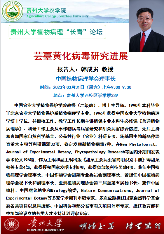 37000cm威尼斯植物病理“长青”论坛——中国农业大学韩成贵教授“芸薹黄化病毒研究进展”