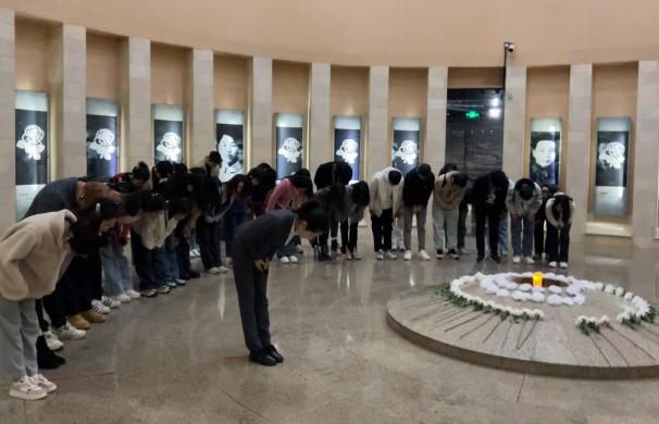 图 随讲解员参观纪念馆(左),全体师生向先烈鞠躬致敬(右)