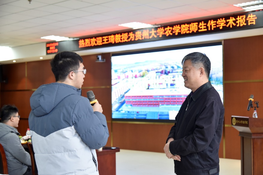 报告结束后,王琦教授与现场师生深入交流。对植物病理生防机制的研究问题,王琦教授建议学生要了解其中的主要机制,了解其机制本源探究其中可以研究的热点,将机制运用于生产实践中并进行印证。对于生物菌肥是否会产生微生物污染的问题,王琦教授说到:“微生物制剂产品的合理使用,能够改善土壤健康水平,从根本上解决问题,从而降低农药化肥的使用频率和成本。粮食生产插上“科技的翅膀”,真正实现了“授农以技、藏粮于技,增产提效、藏粮于地”的目的,让农民的腰包彻底鼓出了安全感。”