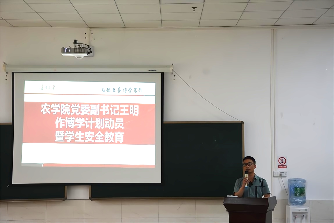王明副书记作博学计划动员和安全教育。他鼓励同学们要及早对自己的毕业去向作规划,了解博学课程。强调同学们在学习生活中要严格遵守法律法规及校规校纪,提高自身安全意识,防诈防骗,注意防范夏季溺水,注意实验安全、交通安全、网络安全等。