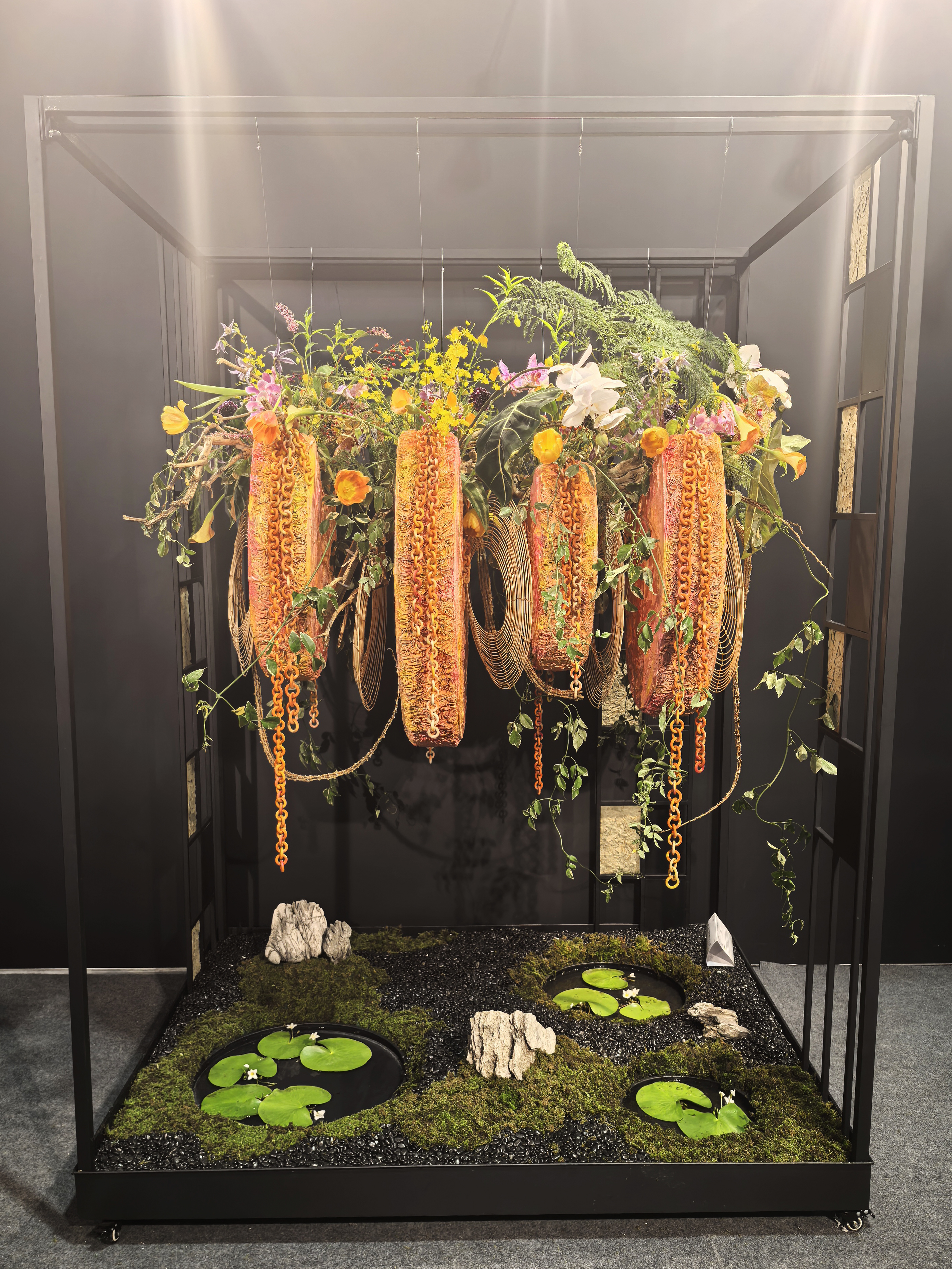 黄玮婷的获奖作品是《月下藤影》和《花影翩跹》。《月下藤影》是一件餐桌花艺作品,以干枯荷叶粘贴满月意象,异质材构筑新月架构,象征自然循环。毛线缠绕的骨架勾勒餐桌轮廓,铁线莲、络石藤蔓自然延展,仿佛月下摇曳的藤影,嘉兰等花材点缀其中,与藤蔓共舞,使每次相聚用餐都充满诗意与浪漫。《花影翩跹》通过架构技法打造悬挂装置,异质材粘贴赋予其独特肌理,使春季花卉得以在空中自由舒展,跳舞兰、蝴蝶兰等花材宛如春日精灵在自然中翩然起舞,花叶和谐交织,展现出春天的生机与美感,捕捉大自然的复苏与活力。