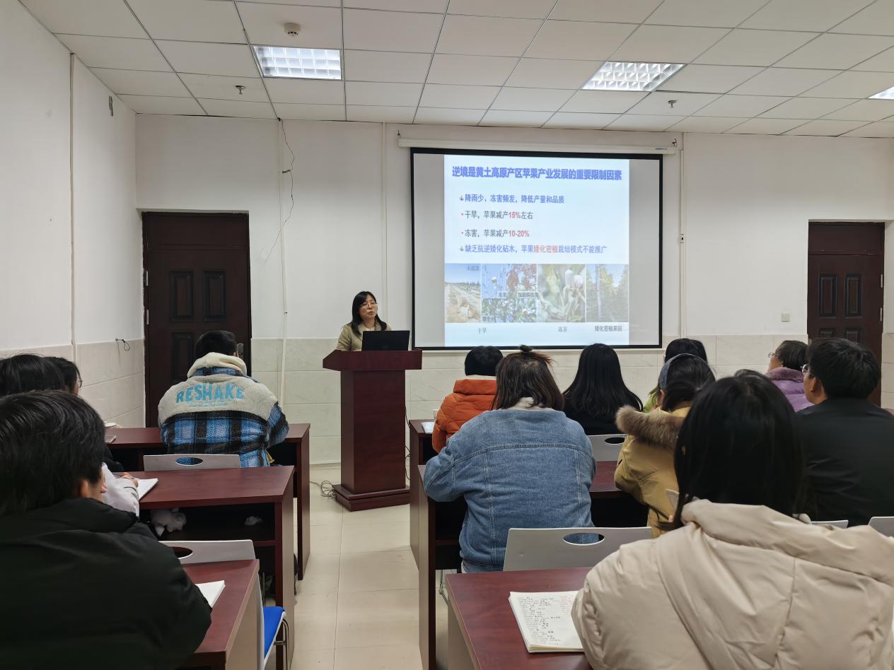管清美教授是国家杰出青年基金获得者,新疆苹果产业技术体系副首席科学家,主要从事苹果耐逆境的分子机制研究。管清美教授的报告题目是《苹果抗旱基因挖掘与应用》,从泛素化、类泛素化、甲基化修饰方面给师生深入剖析了苹果相关抗旱基因的挖掘及应用情况。