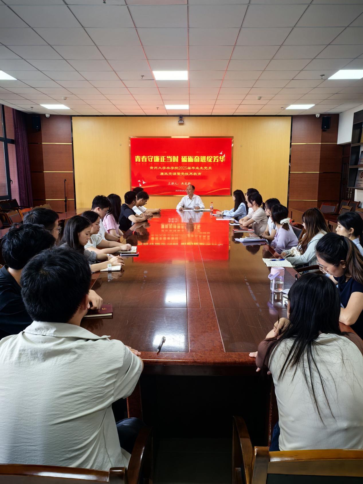 6月24日,农学院党委书记冉龙彪在崇学楼338会议室为2025届毕业生党员代表讲授廉政党课暨党性再教育,引导青年党员系好走向社会的“第一粒扣子”。