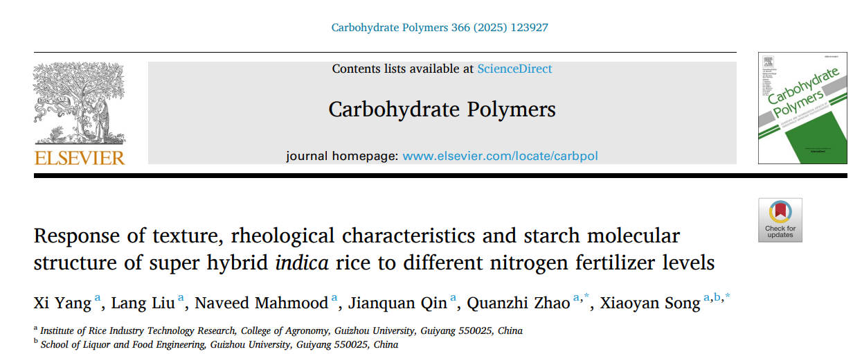 近日,Carbohydrate Polymers(中科院1区,Top,IF=12.5)在线发表了37000cm威尼斯水稻产业技术研究院赵全志教授团队题为:Response of texture, rheological characteristics and starch molecular structure of super hybrid indica rice to different nitrogen fertilizer levels的研究性论文。该研究阐明“淀粉-蛋白互作”对超级杂交籼稻的质构特性和流变学特性的影响规律,从淀粉分子结构解析了不同氮肥水平对稻米品质的影响机理,研究结果对氮肥的高效利用具有重要意义。